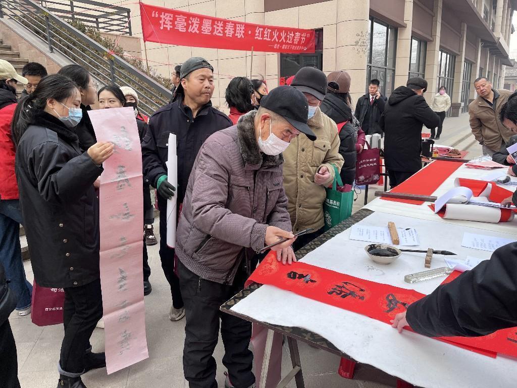 “金蛇狂舞春添彩,紫燕翻飞柳泛青”“春回大地蛇呈瑞,福满人间鹊报祥”……虽然天气寒冷,但活动现场气氛热烈,书法家们挥毫泼墨,笔锋婉转间,一副副寓意吉祥的春联跃然纸上。志愿者们在一旁添墨压纸晾字,社区居民驻足欣赏,领取自己心仪的春联。